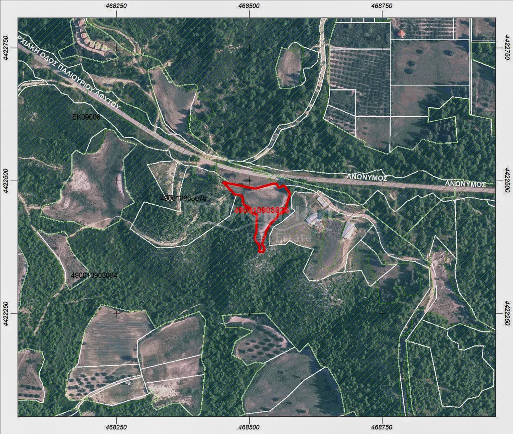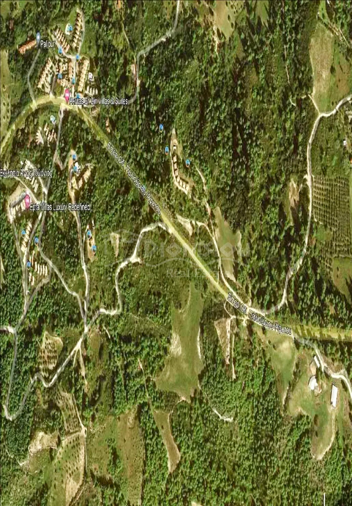 Земельный участок площадью 6000 кв. метров находится в окрестностях поселков Агия Параскеви и Палиоури в 4,5 км от пляжа Гларокавос, 6,4 км до пляжей Хруссо и в 6 км от пляжа Навагос.