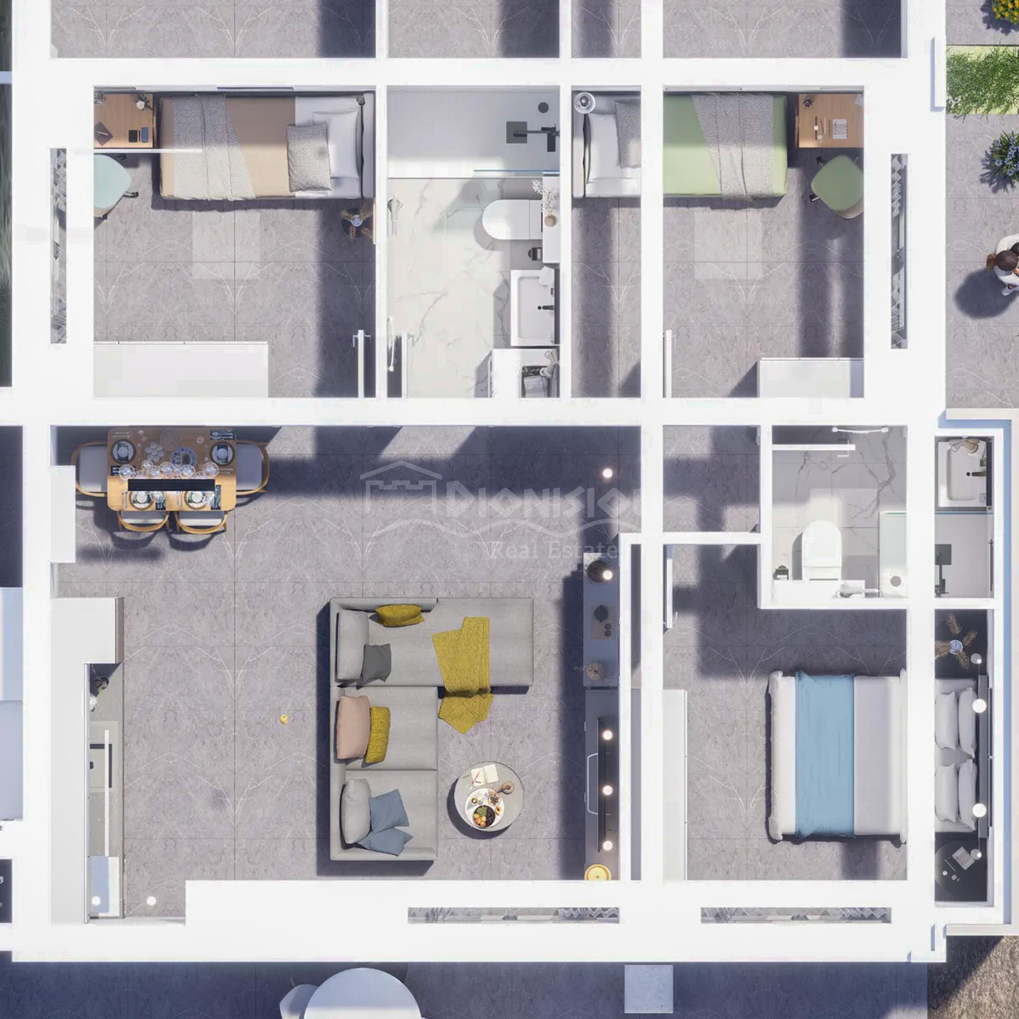 Апартамент состоит из гостиной с кухней, 3-х спален и 2-х ванных комнат.