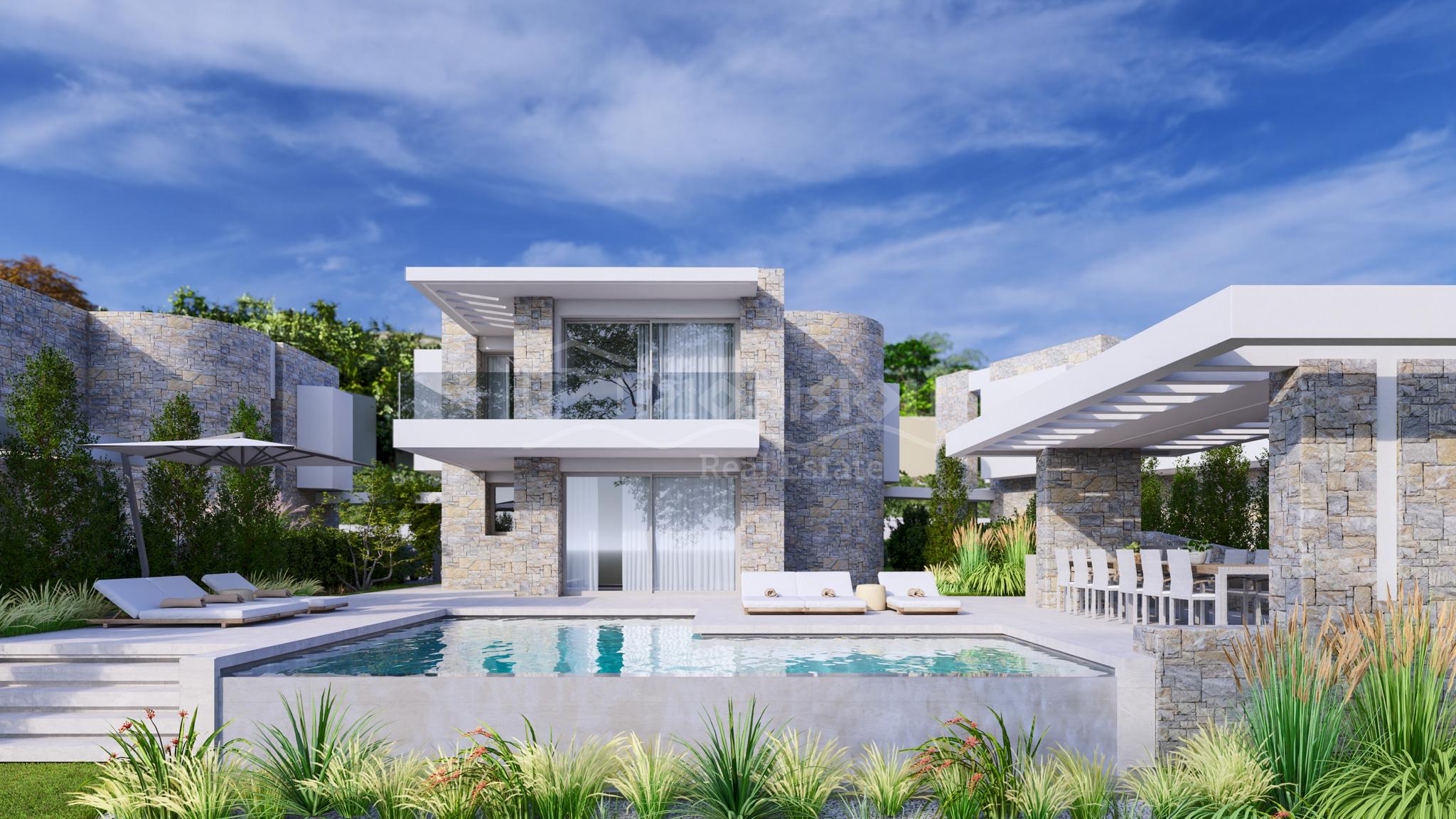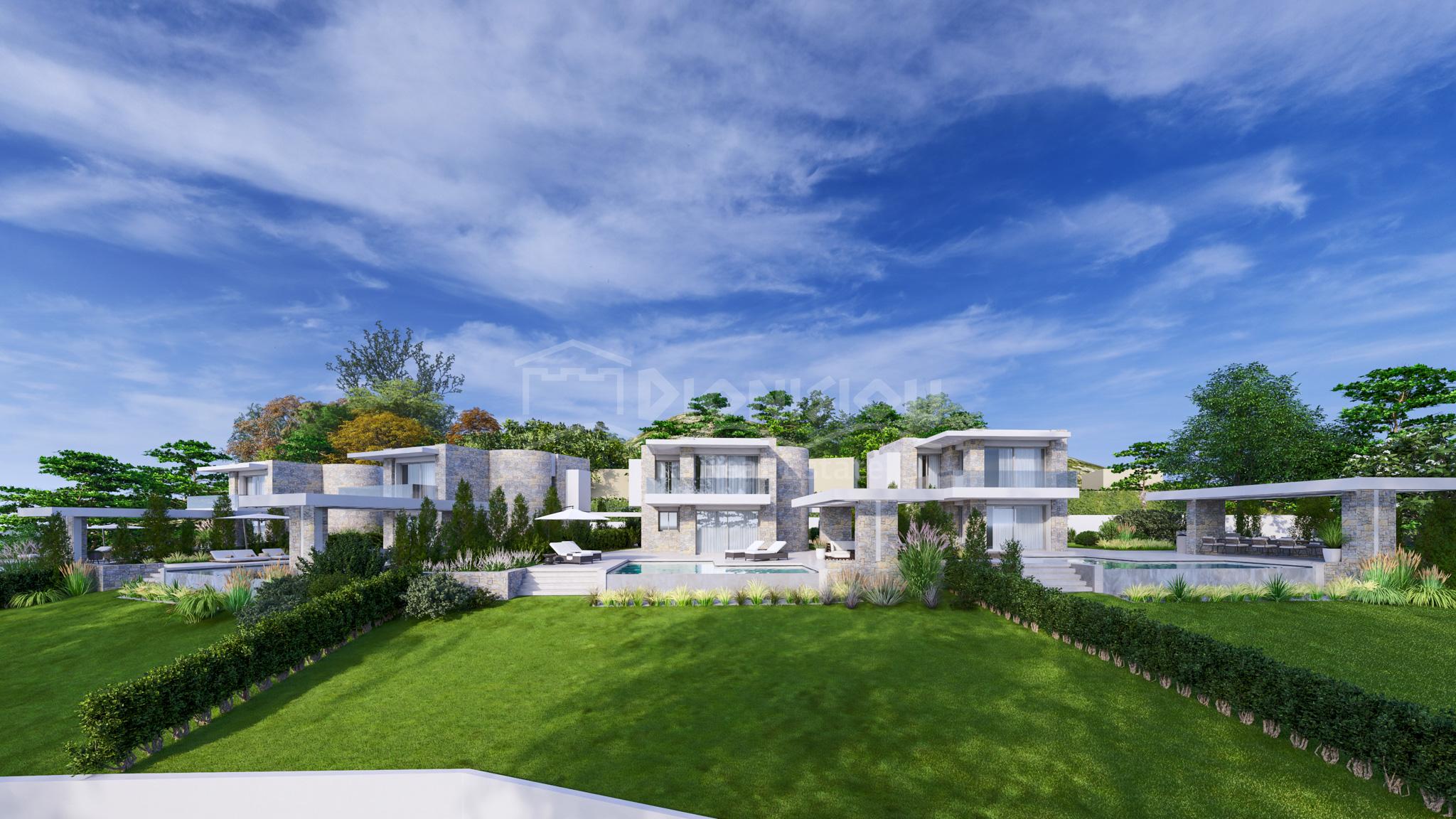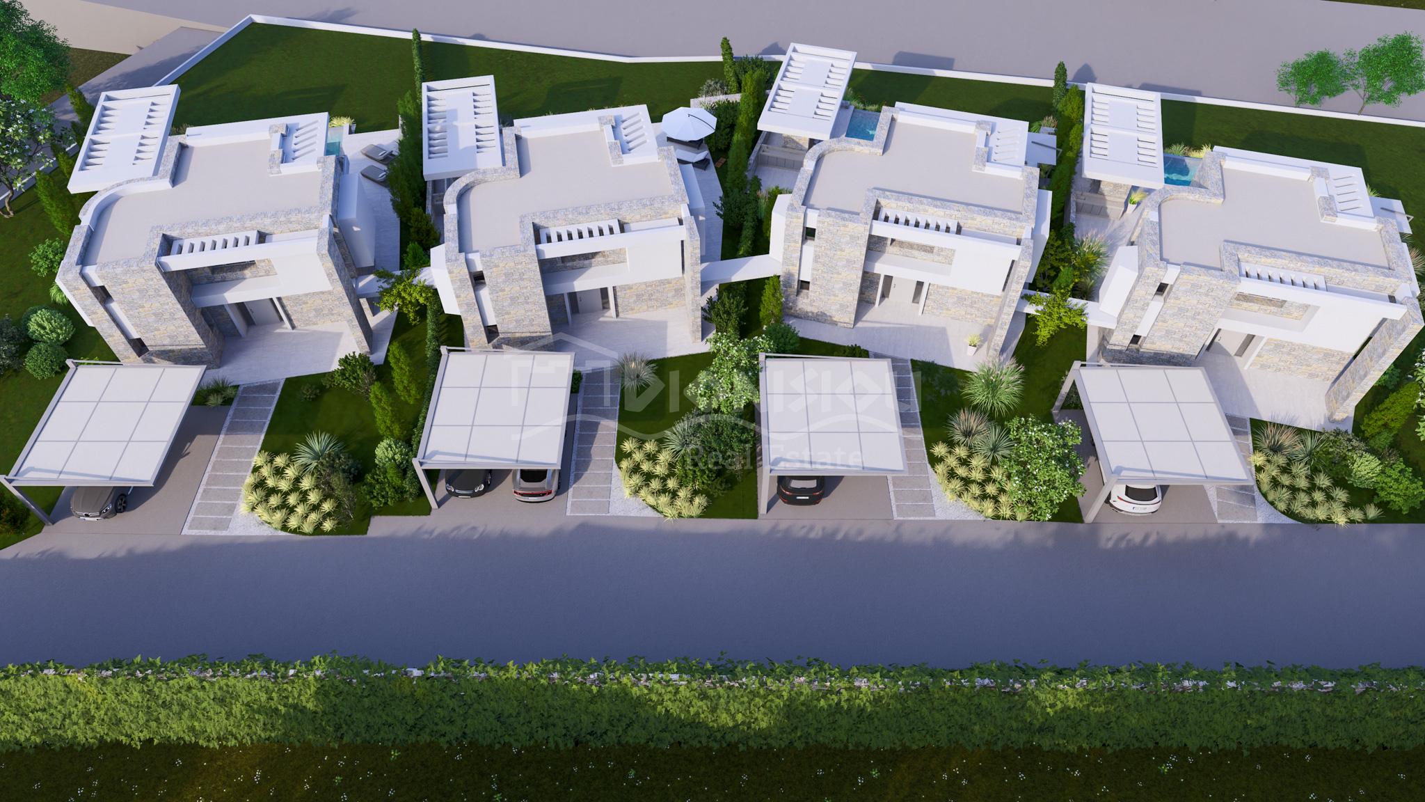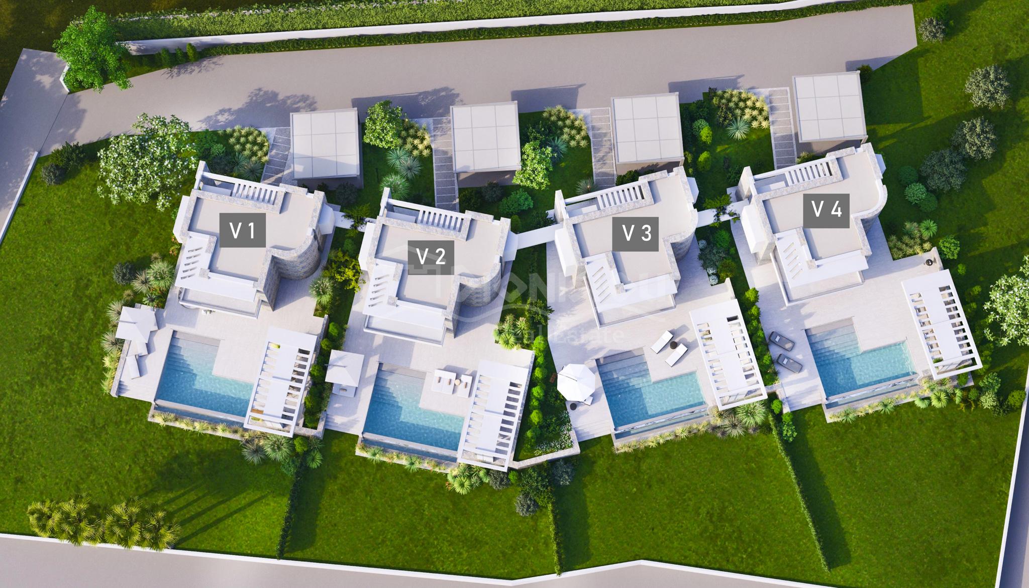 К продаже предлагаются 4 эксклюзивных виллы площадью 190 кв. метров с земельными участками 1.276 кв. метра (вилла 1), 694 кв. метров (вилла 2), 655 кв. метров (вилла 3) и 1.087 кв. метров (вилла 4). У вилл есть собственный бассейн.