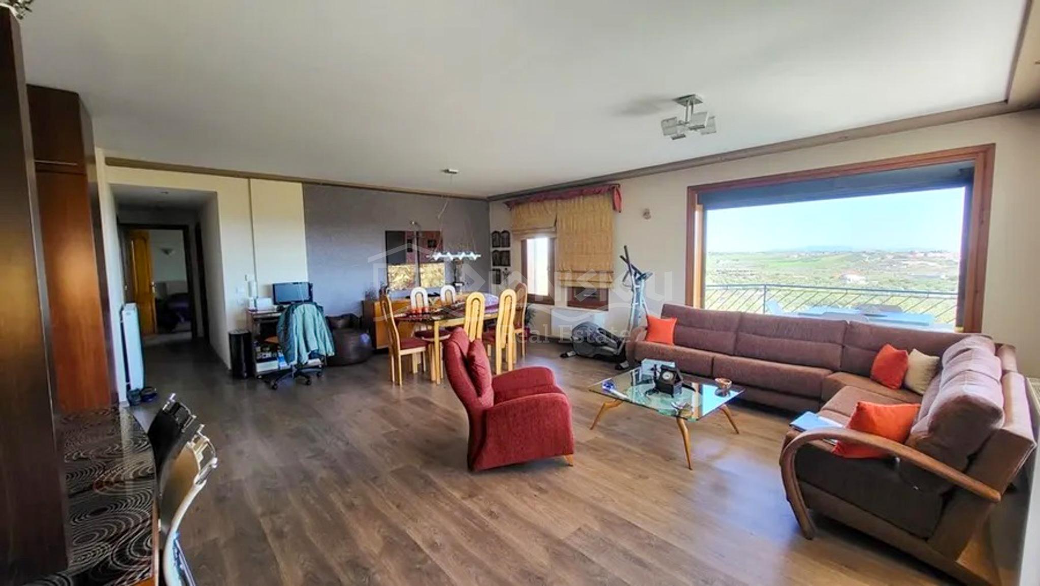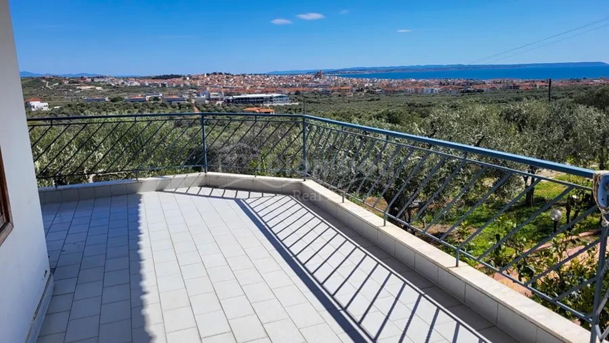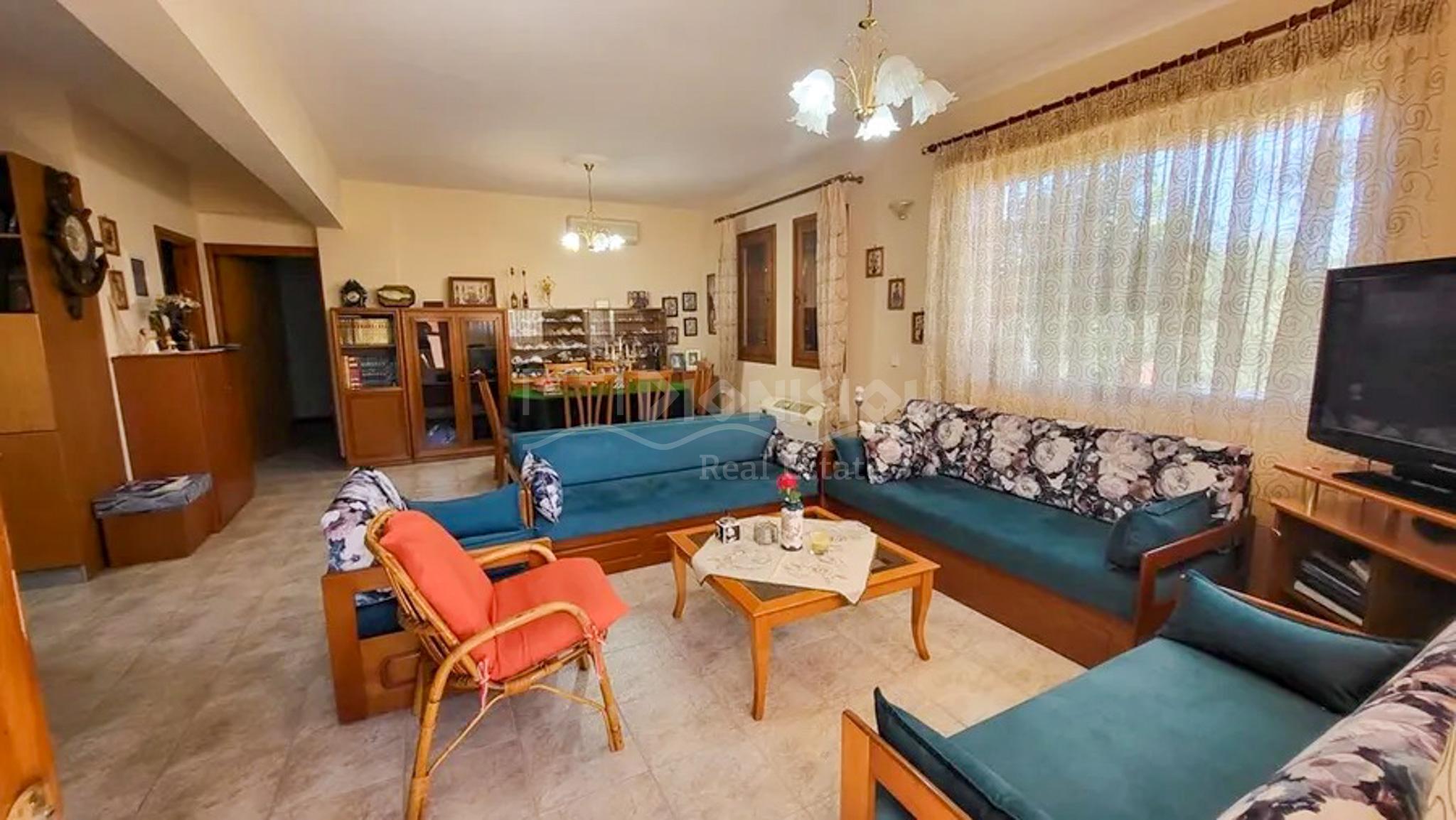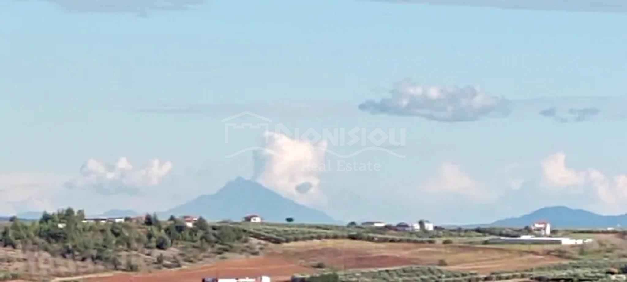 Дом окружен участком 3300 кв. метров с паркингом. Двухэтажный дом расположен на холме, с которого открывается вид на море, гору Олимп, город, оливковые рощи и холмы.
