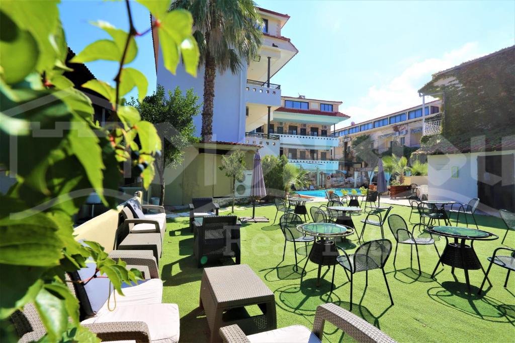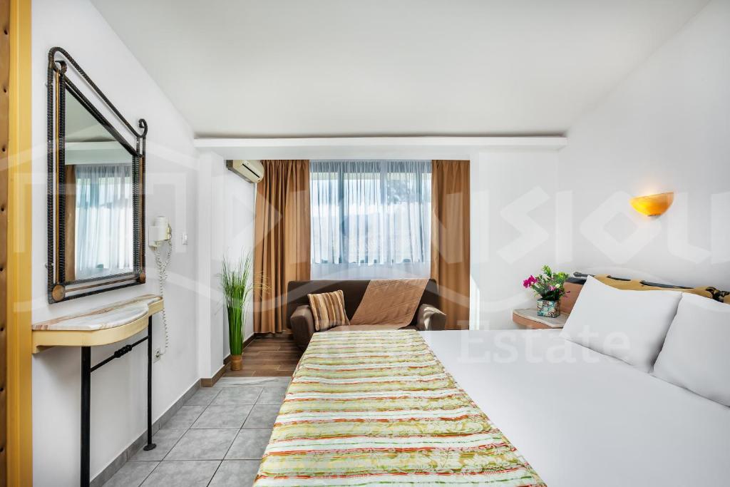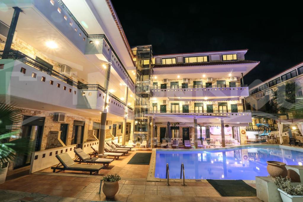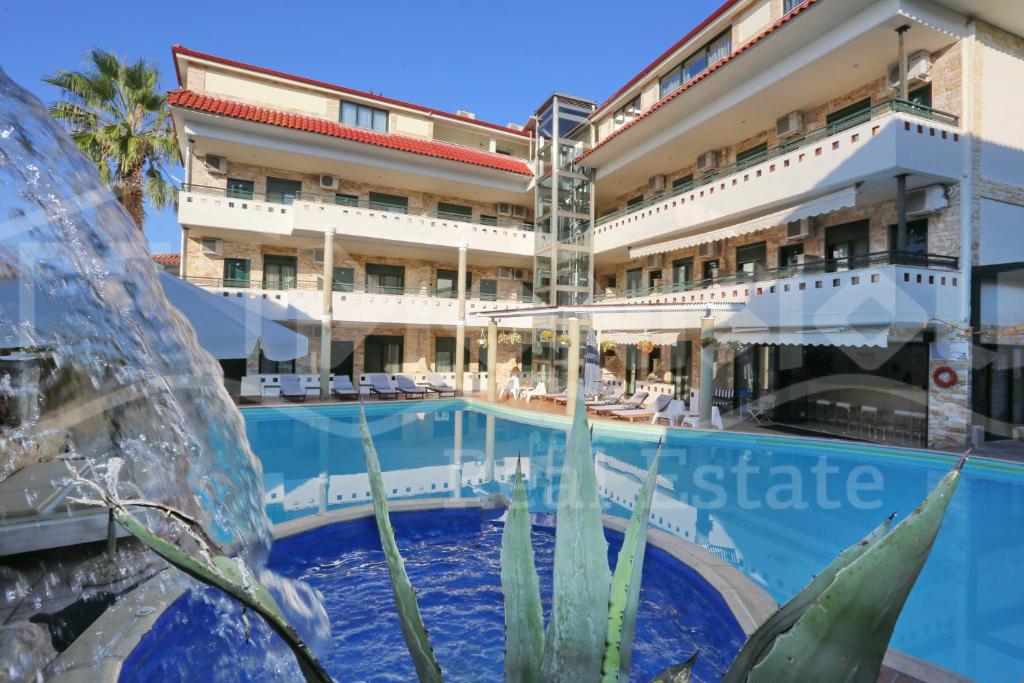 Отель находится в популярном туристическом поселке на восточном побережьи полуострова Кассандра в самом его центре 50 метрах от шикарного песчаного пляжа.