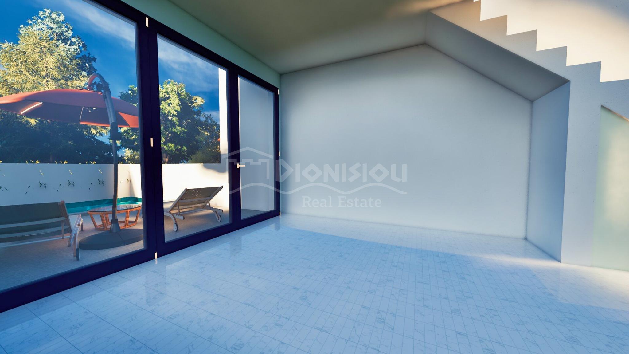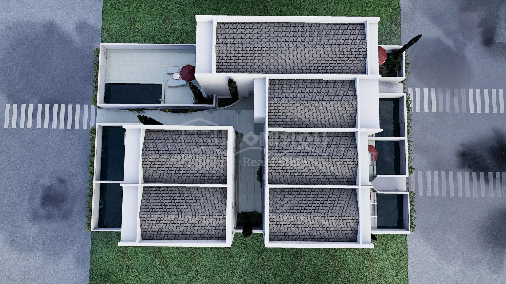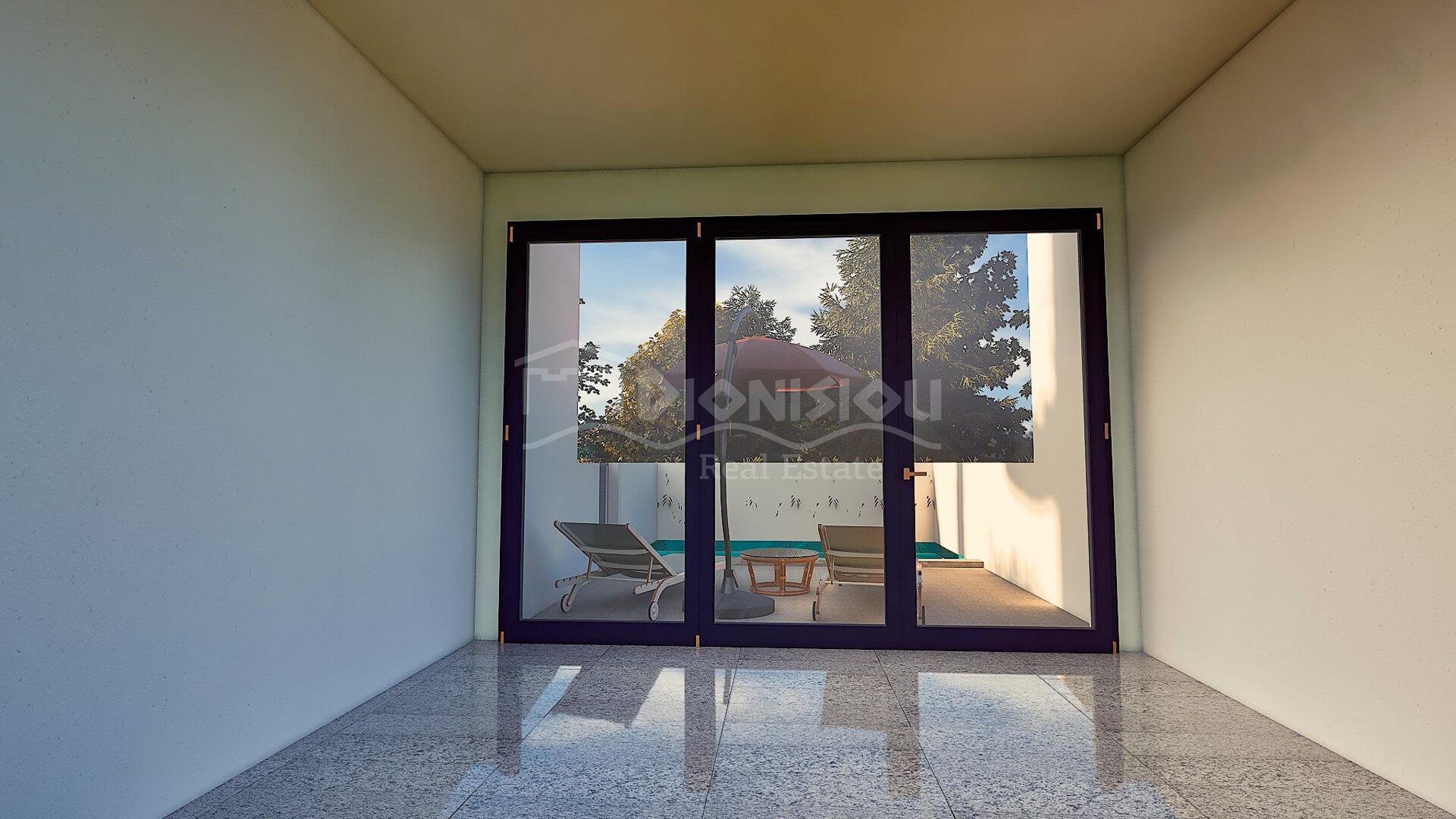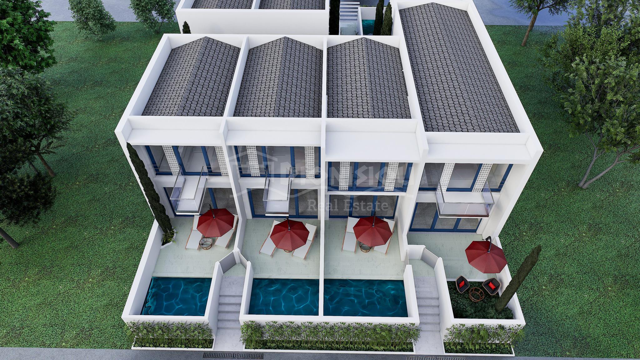 У таунхаусов есть собственный сад 23 кв. метра с бассейном (7 кв. метров).